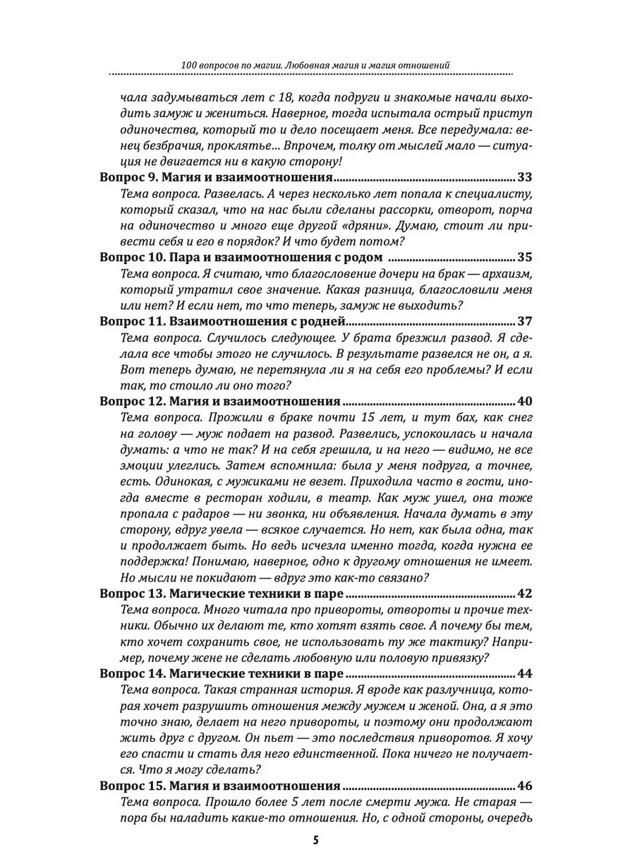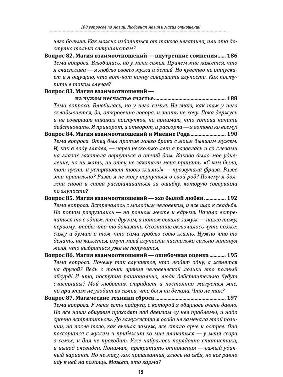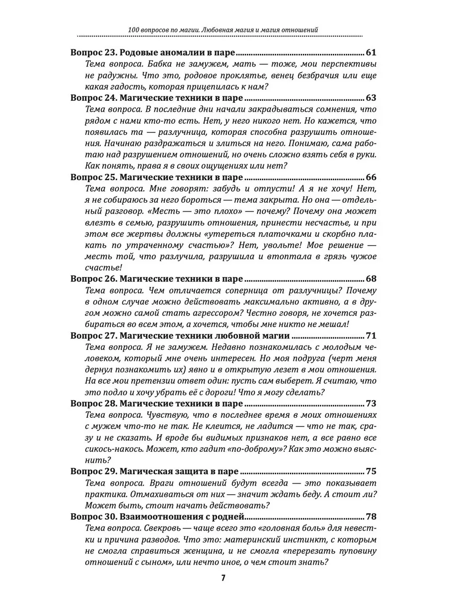 Книга из серии «100 вопросов по магии» — «Любовная магия и магия отношений», посвящена теме взаимоотношений в роду и между людьми, вопросам отношений и взаимоотношений, чувств, эмоций и множества иных факторов, влияющих на отношения в паре. Вы сможете не только получить ответы на наиболее распространенные вопросы, но и разобраться в механизмах ответов — наглядно понять, почему автор оперирует теми или иными данными. И, наверное, самое главное, вы сможете использовать магические технологии, которые помогут вам в работе с поставленными вопросами.