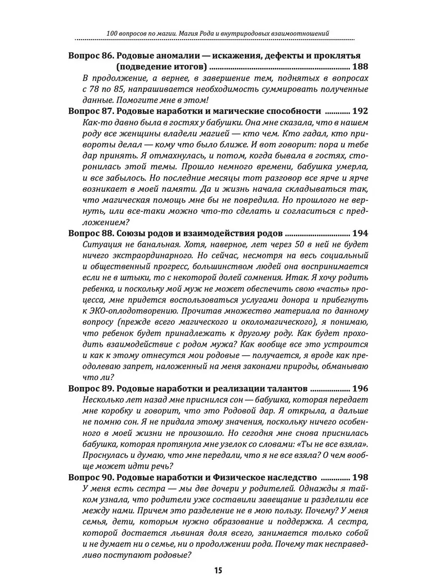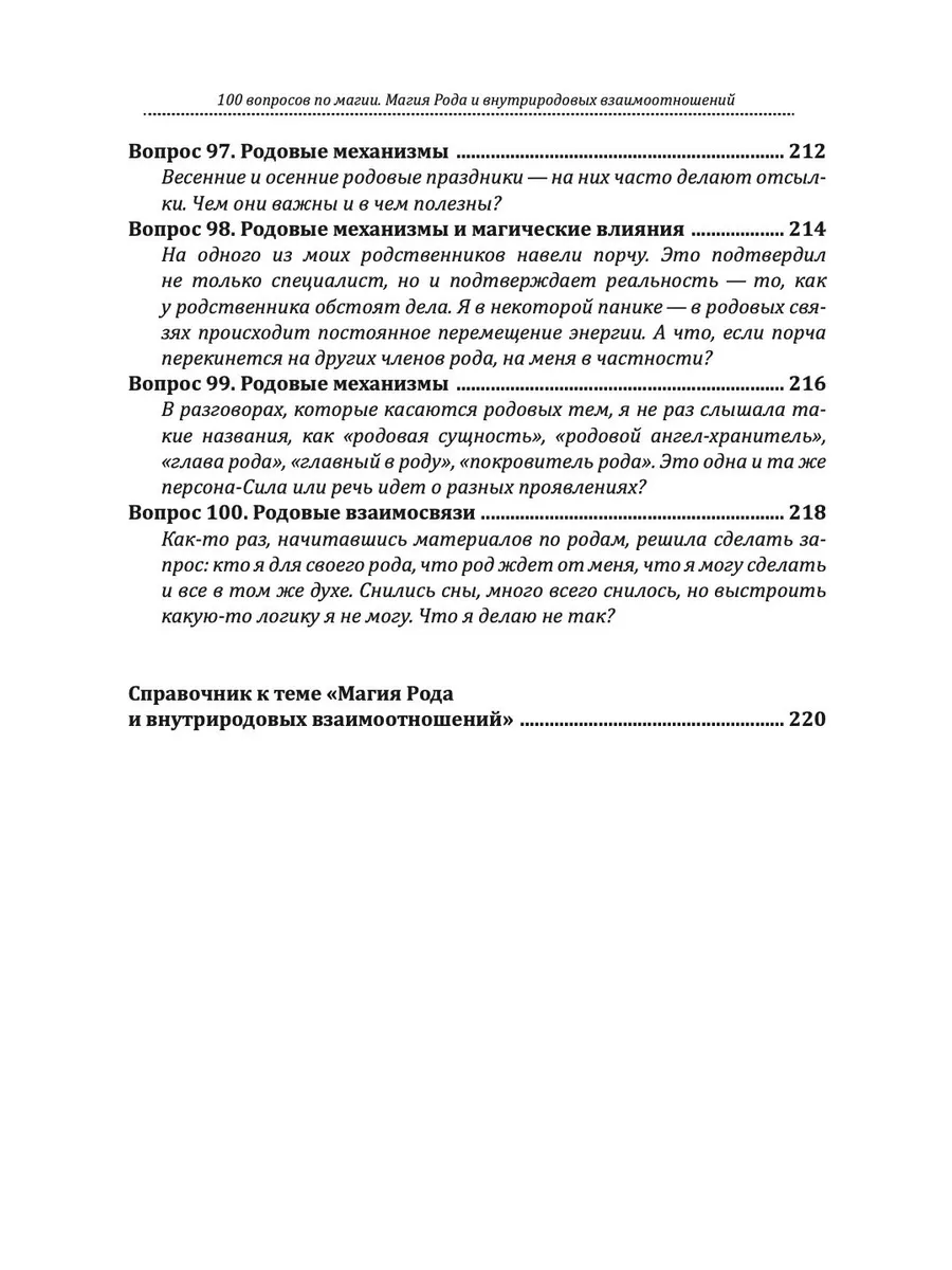 Книга из серии «100 вопросов по магии» — «Магия Рода и внутриродовых взаимоотношений», посвящена теме взаимоотношений в роду и между родами, теме внутриродовых конфликтов, аномалий и иных событий, доставляющих множество неприятностей. Вы сможете не только получить ответы на наиболее распространенные вопросы, но и разобраться в механизмах ответов — наглядно понять, почему автор оперирует теми или иными данными. И, наверное, самое главное, вы сможете использовать магические технологии, которые помогут вам в работе с поставленными вопросами.