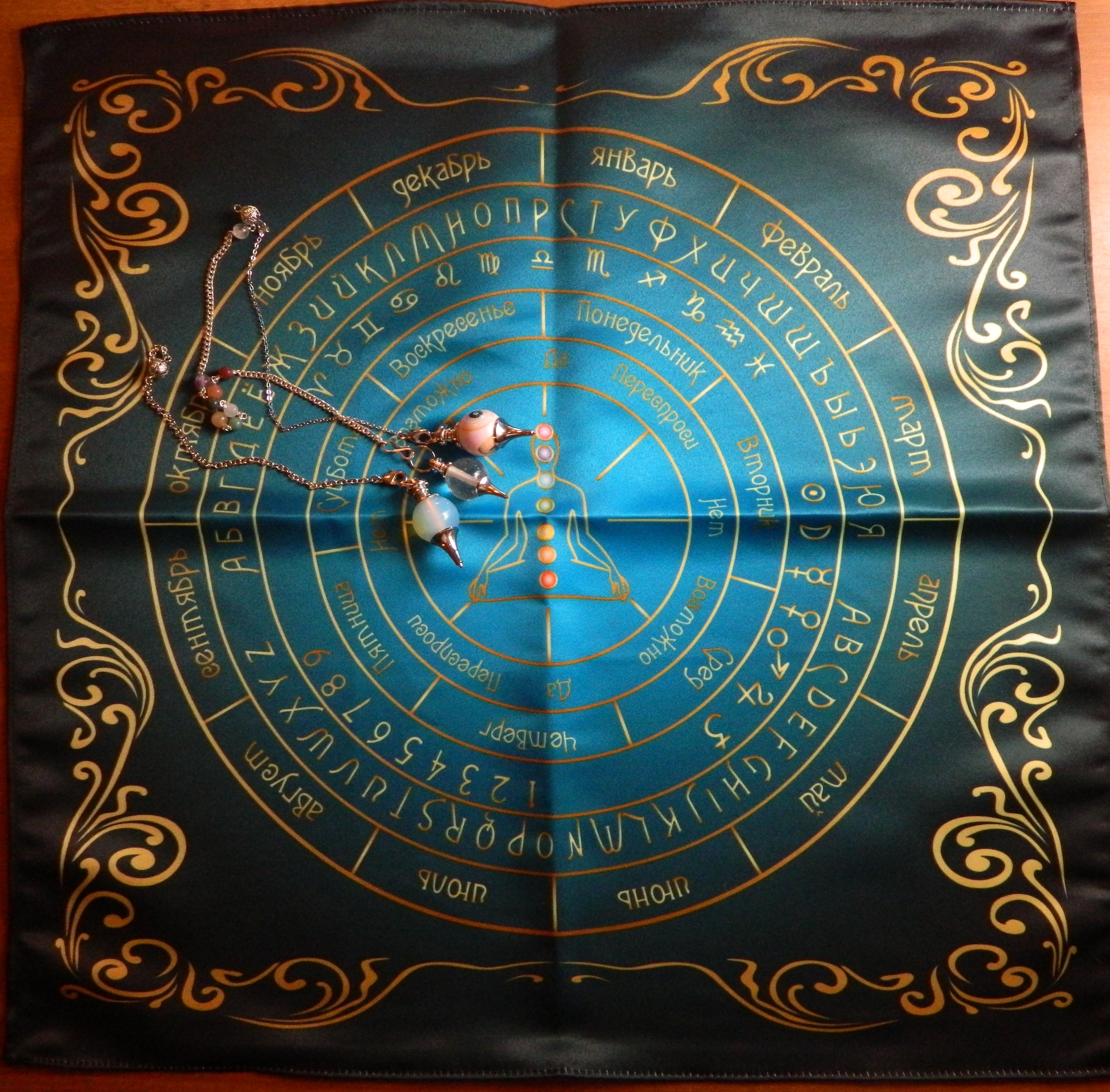 Алтарная скатерть для маятника предназначена для практической работы с любыми видами маятника. Позволяет получать ответы: - даты – года, месяца, дни недели, дни - имена, фамилии, иные уточнения в словах. - классические ответы – да, нет, возможно, переспроси и т.д. - знаки Зодиака - планетные соответствия - чакровую диагностику и состояние чакровой системы - многое другое.