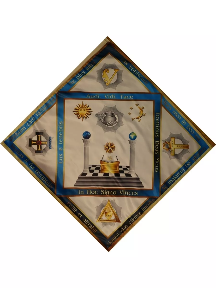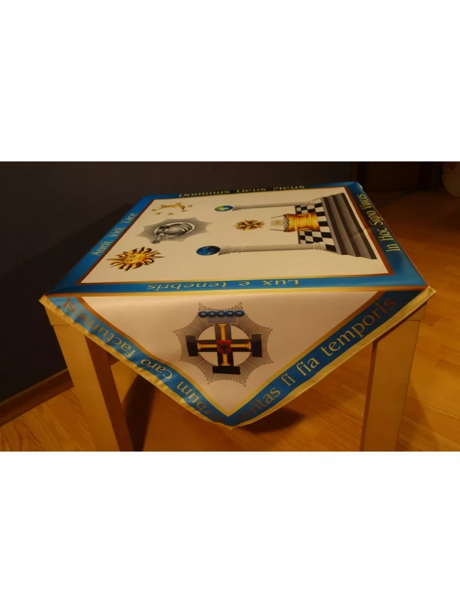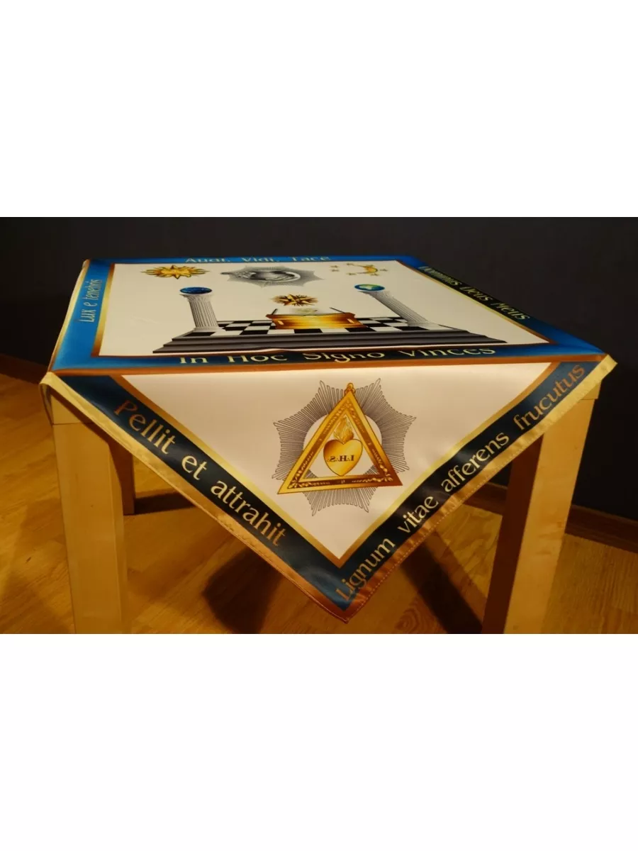 Алтарная скатерть Масонских степеней 8,9,10,11,12. Скатерть Масонского алтаря создана с учетом требований классического алтаря. Содержит основные девизы Масонов. Украшен символами степеней 8,9,10,11,12. Размер 80x80 см.