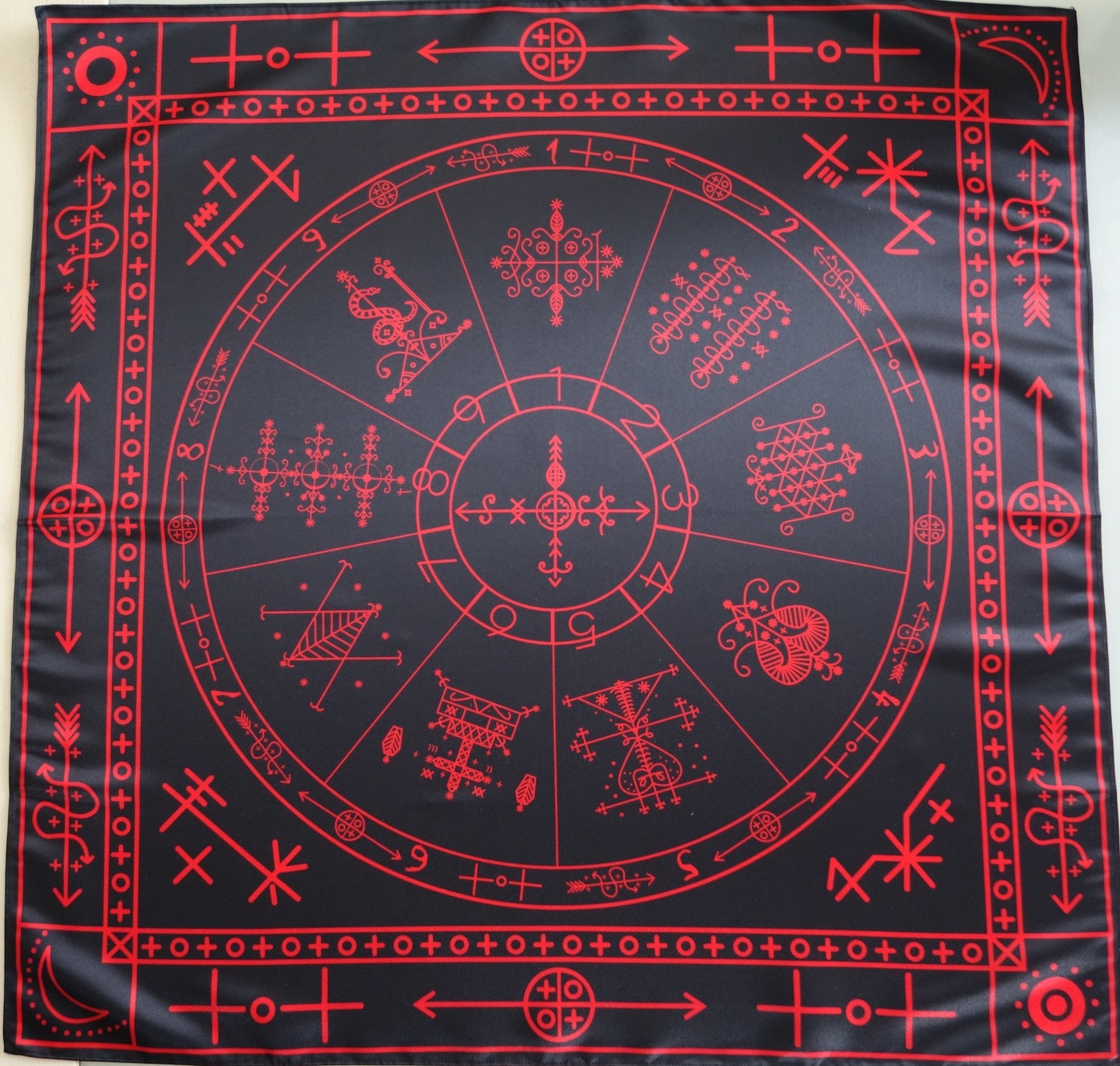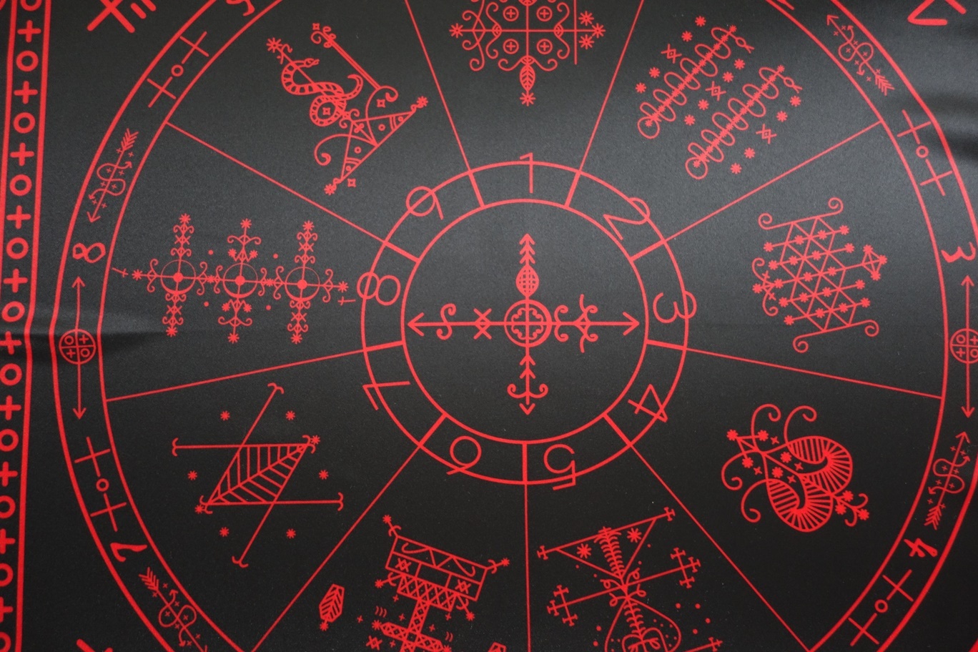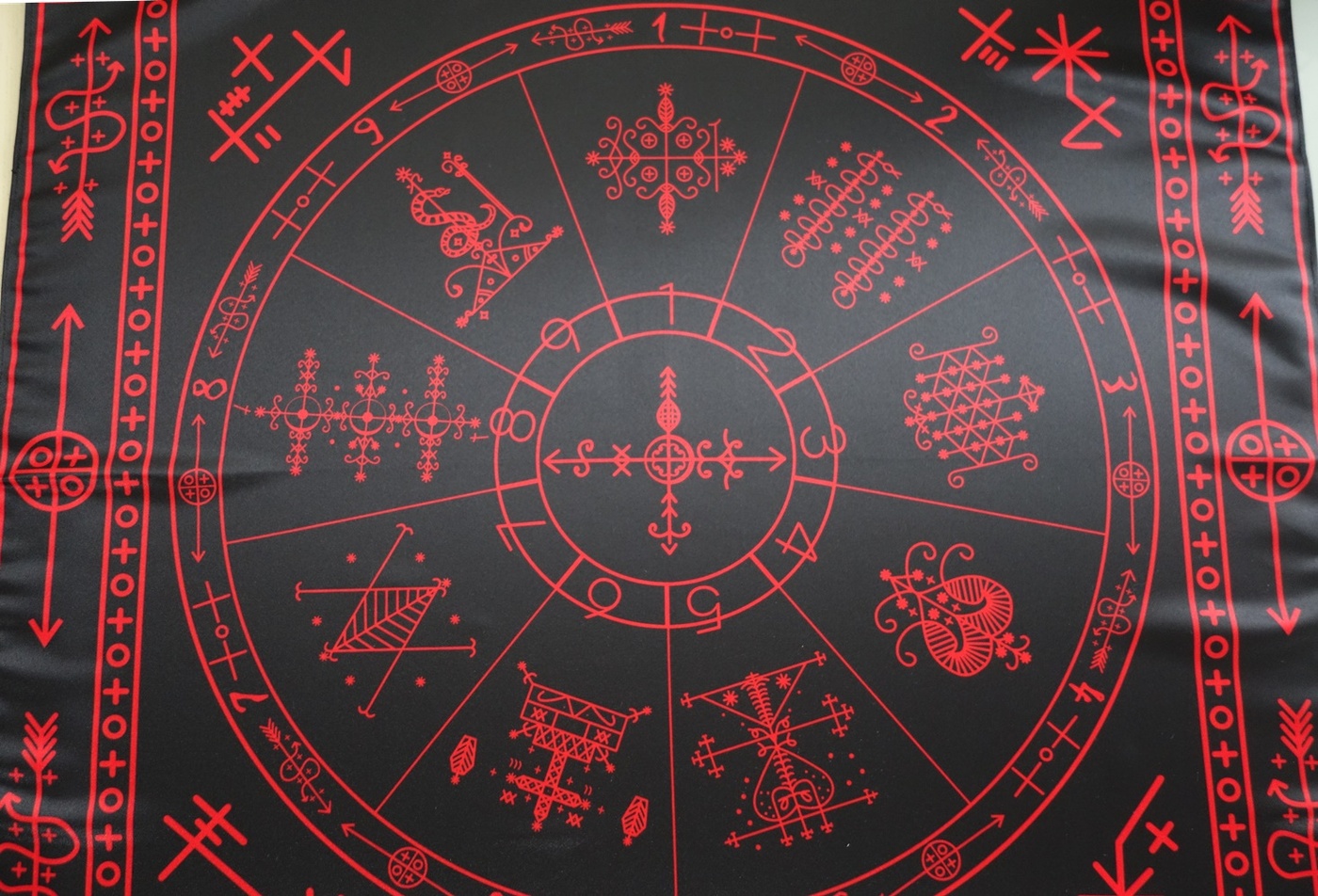 Большая Ритуальная Скатерть Обряды Вуду – скатерть, которая используется для проведения ритуалов и обрядов Вуду. Она обеспечивает защиту оператора, а также может использоваться как жертвенный алтарь для проведения церемоний Вуду. На Скатерти нанесены имена - Папа Легба, Дамбалах , Огоун , Эрзулие дантон , Бригитт, Барон Самеди Барон Суббота, Аизан Великетем , Марасса Джемеакс , Damballah Wedo