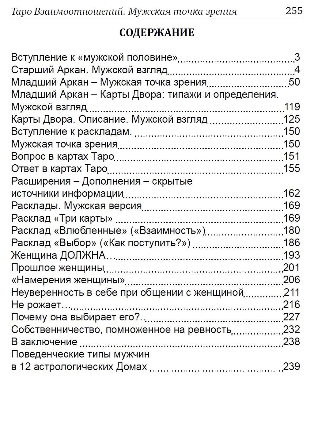В книге подробно и с примерами разобраны 17 уникальных раскладов: Развитие женских достоинств, Ошибки разведенных – Поиск причин развода, Неуверенность в себе в общении с мужчиной, Понимание мужчины и его намерений, Почему не зовут замуж? Как оценить/подчеркнуть свои достоинства и спрятать свои недостатки, Неполная семья, Требования в мужчине – за или против? – формулы корректного управления, Хочу – ради чего, во имя чего, для чего – три вида мужчин – бежим, лежим, волочимся, Дрессировка и приучение, Женщина ДОЛЖНА …. Прошлое женщины, Намерения Женщины, Неуверенность в себе в общении с женщиной, Не рожает…. Почему выбирает его?... Собственничесвто помноженная на ревность.