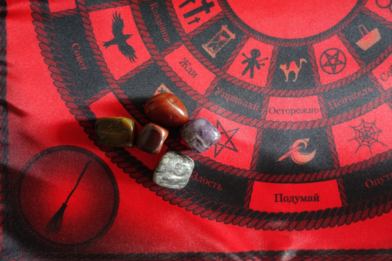 В комплект входят: Скатерть размер 40х40 сантиметров, атлас, набор из 5 произвольных камней.