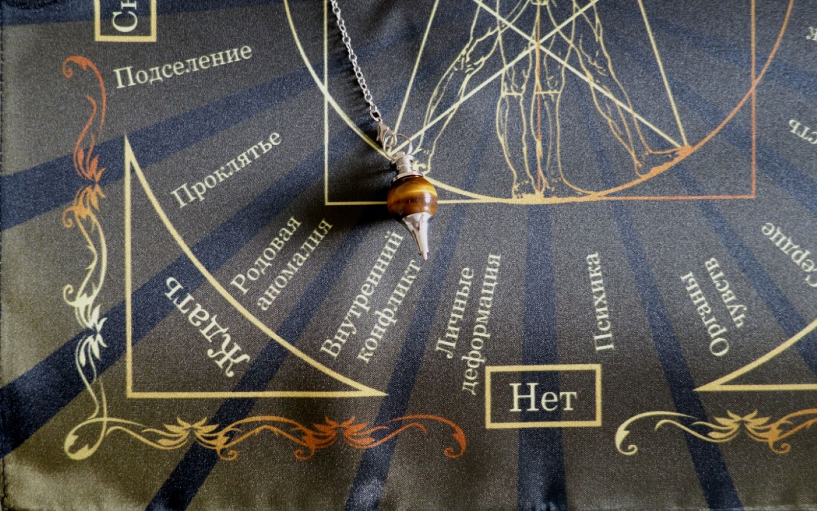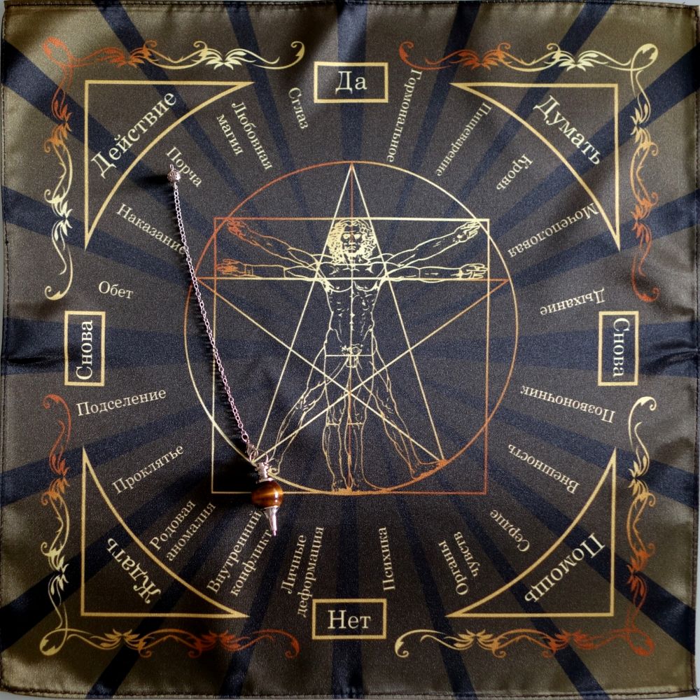 Скатерть Магические воздействия и Здоровье человека является уникальной для работы с маятником, равно как и все, приведенные здесь. Она позволяет выявить наличие магического воздействия, определить очаг заболевания, которое является последствием магического воздействия или реальных событий. Безусловно, она не дает максимального количества информации по воздействию или болезни. Но тенденция и общий толк происходящего будет вам понятен. Таблица имеет разделение на левую и правую части. Слева – магия, справа – физиология.