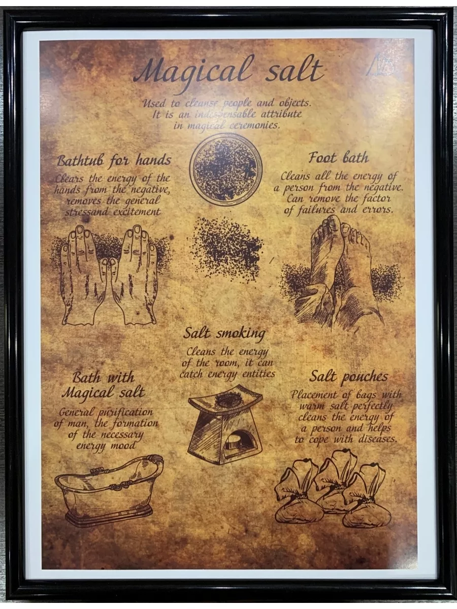 Магическая соль Постер магический соли П-006Постер магической соли - демонстративная и наглядная инструкция по использованию магический соли. Инструкция-свиток покажет вам как наиболее эффективнее использовать соль в магических практиках. Постер может стать и красивым украшением рабочего убранства и справочником, который подскажет нужную информацию. Размер А 3 (297х420 мм).Рамка 300х400 мм, пластик, пластиковое стекло Бумага.