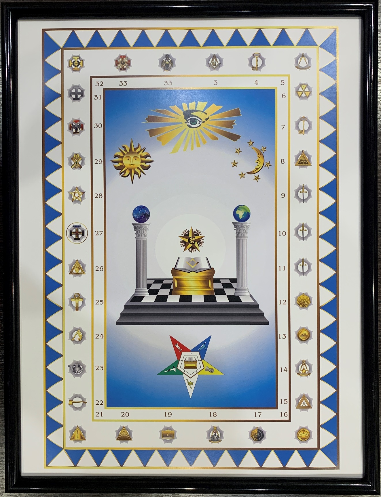 Большой Масонский Алтарь-панно создан на основе древних церемониальных традиций. Он обладает всеми атрибутами и характеристиками. Алтарь обрамлен символами всех масонских степеней, начинается с начального и заканчивается более высокими степенями.