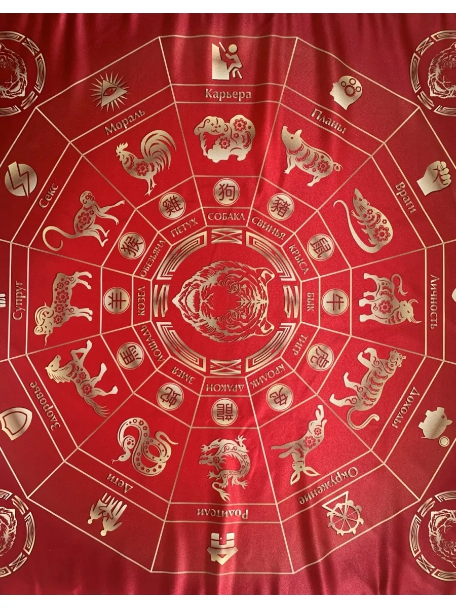 Предсказательная Скатерть Года тигра Скатерть Года тигра создана для помощи в предсказании с использованием Таро для того чтобы получить точные и развернутые предсказания в Новом наступающем году Тигра. Для Вас подготовлено несколько раскладов которые дадут вам прогноз на Новый год. Скатерть можно использовать все 12 месяцев Нового года - она предоставит вам данные в любой месяц года Тигра. Вы можете использовать такие расклады как "Грядущий год", "Интерес", "Советы и рекомендации" или другие расклады, базирующиеся на схеме 12 Астрологических домов. Размер скатерти 80х80 см. - 36х36 дюймов Материал - сатен.