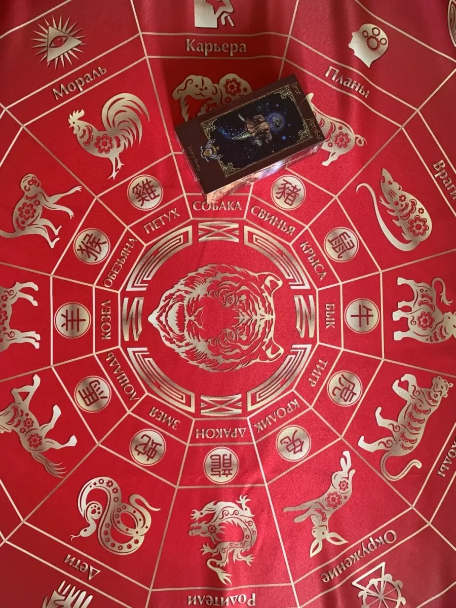 Предсказательная Скатерть Года тигра + Колода Таро Алфавит Скатерть Года тигра создана для помощи в предсказании с использованием Таро для того чтобы получить точные и развернутые предсказания в Новом наступающем году Тигра. Для Вас подготовлено несколько раскладов которые дадут вам прогноз на Новый год. Скатерть можно использовать все 12 месяцев Нового года - она предоставит вам данные в любой месяц года Тигра. Вы можете использовать такие расклады как "Грядущий год", "Интерес", "Советы и рекомендации" или другие расклады, базирующиеся на схеме 12 Астрологических домов. Размер скатерти 80х80 см. - 36х36 дюймов Материал - сатен Колода Таро Алфавит.