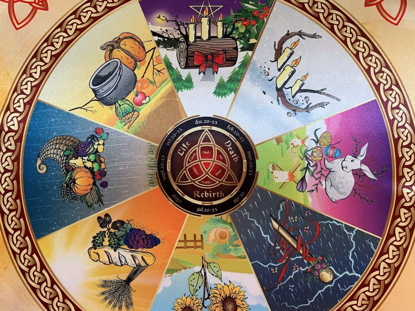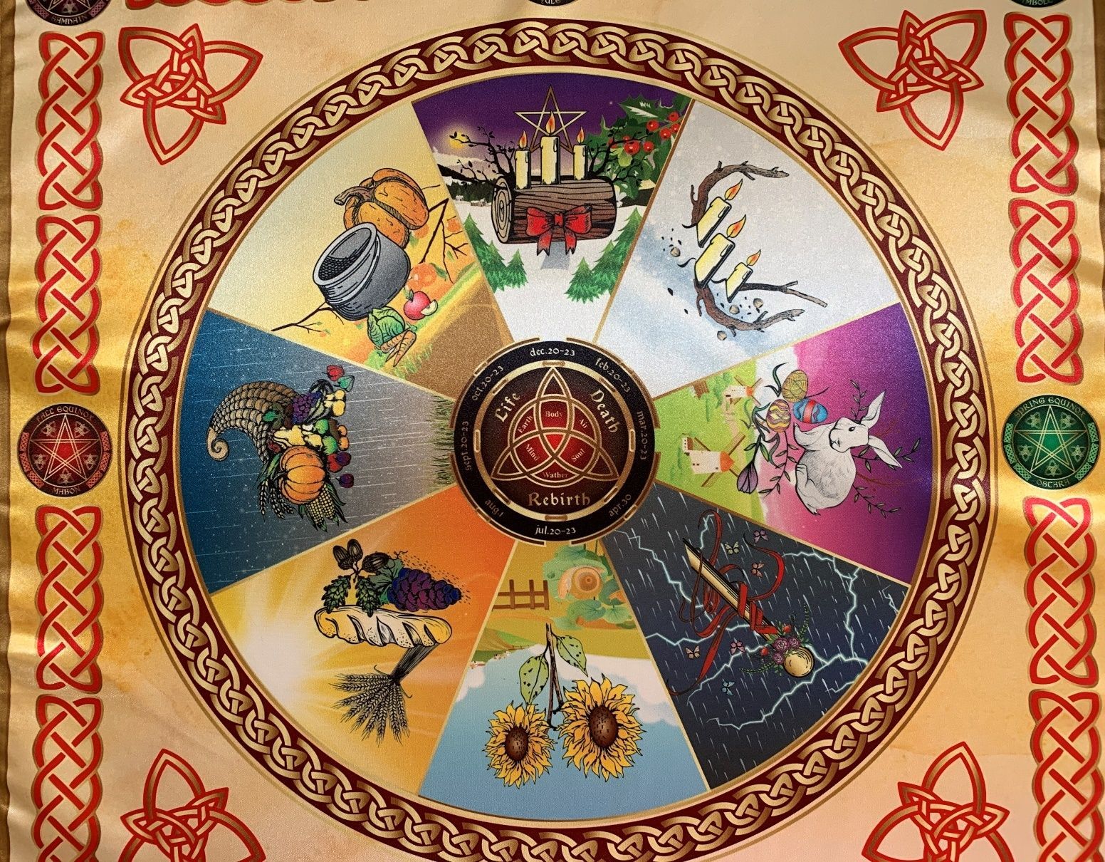 Скатерть Колесо жизни Времена года содержит изображения и символизм всех 8 праздников древнего языческого круга Колесо года. Скатерть может использоваться как обрядовый алтарь, а также выполнять декоративную функцию.