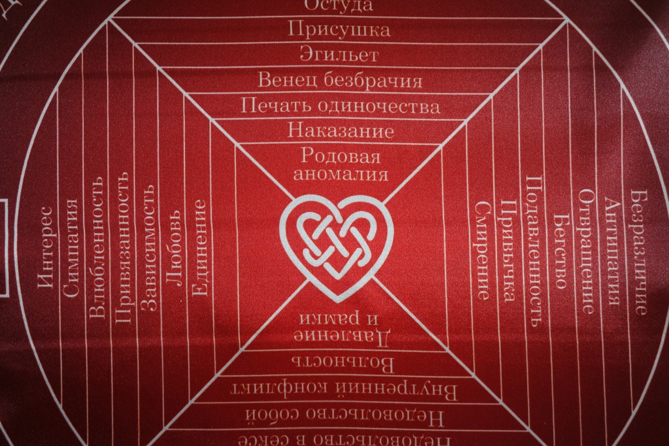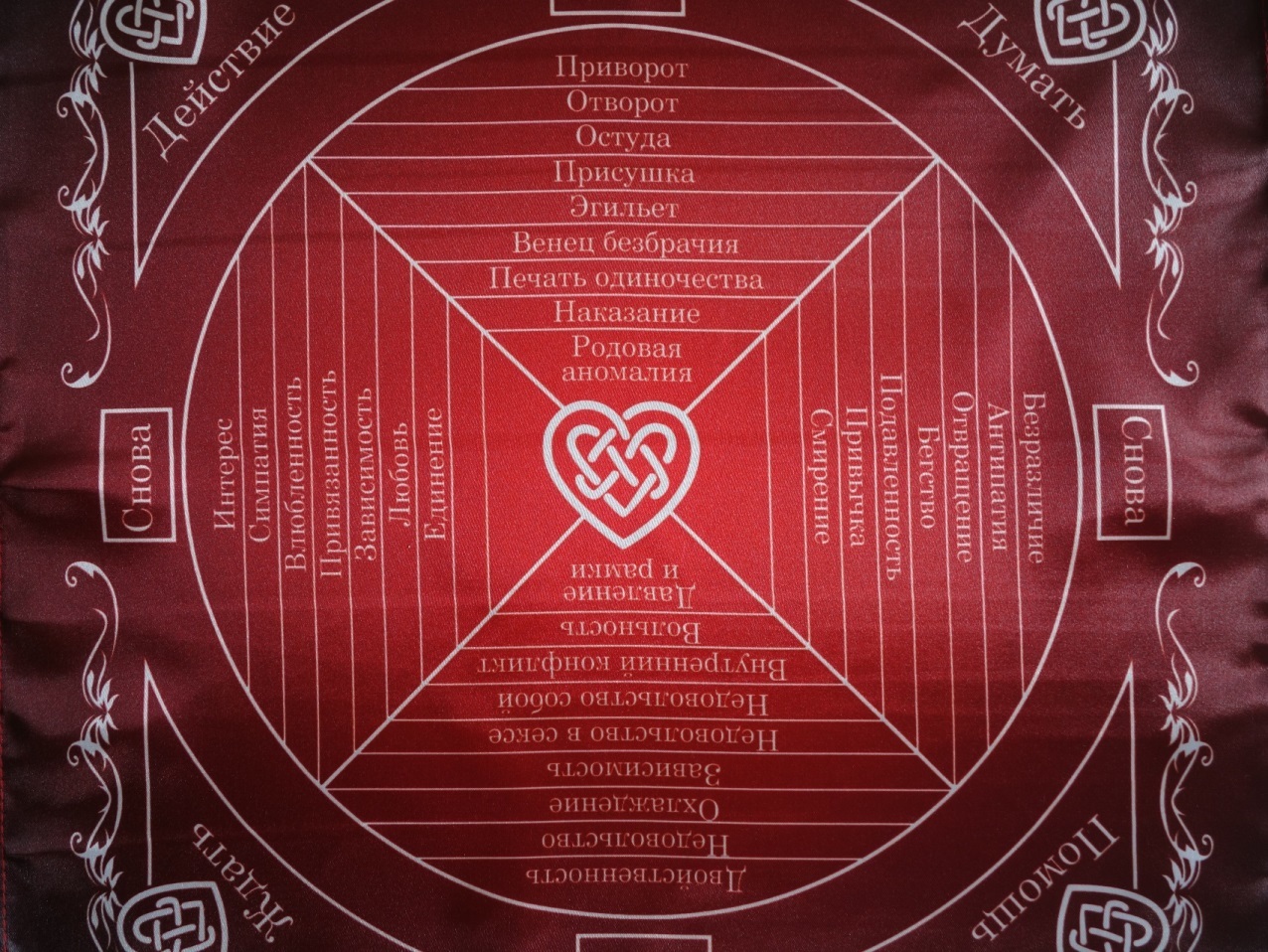 Скатерть Любовной магии и Отношений имеет 4 раздела, по 2 на каждый случай любовных отношений. Одна ее часть покажет наличие или магических влияний, а также подоплеку – почему это магическое влияние «село» на человека и каковы его последствия. А вторая часть необходима для того, чтобы понять, что происходит в отношениях людей. Часто проблемы во взаимоотношениях носят человеческий, бытовой характер. Но бывает и иначе.