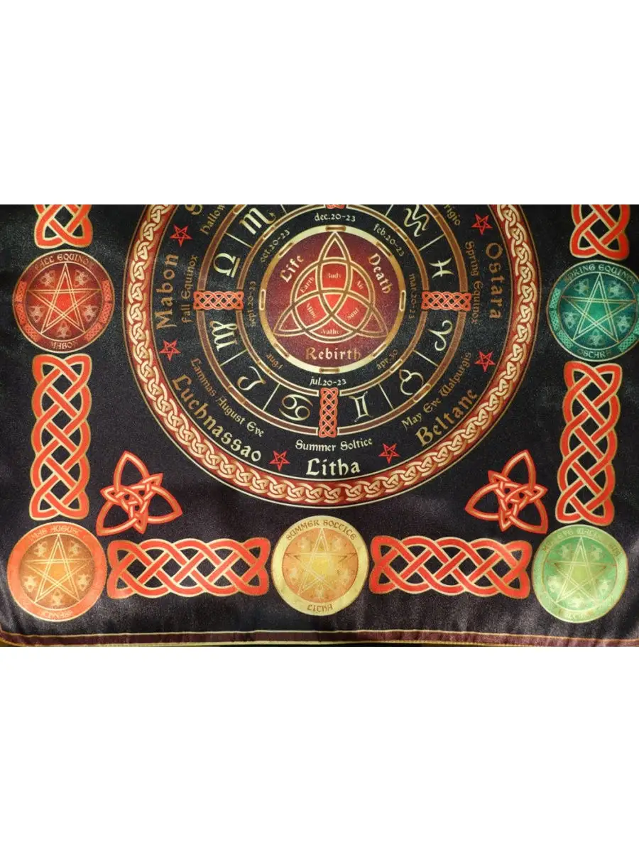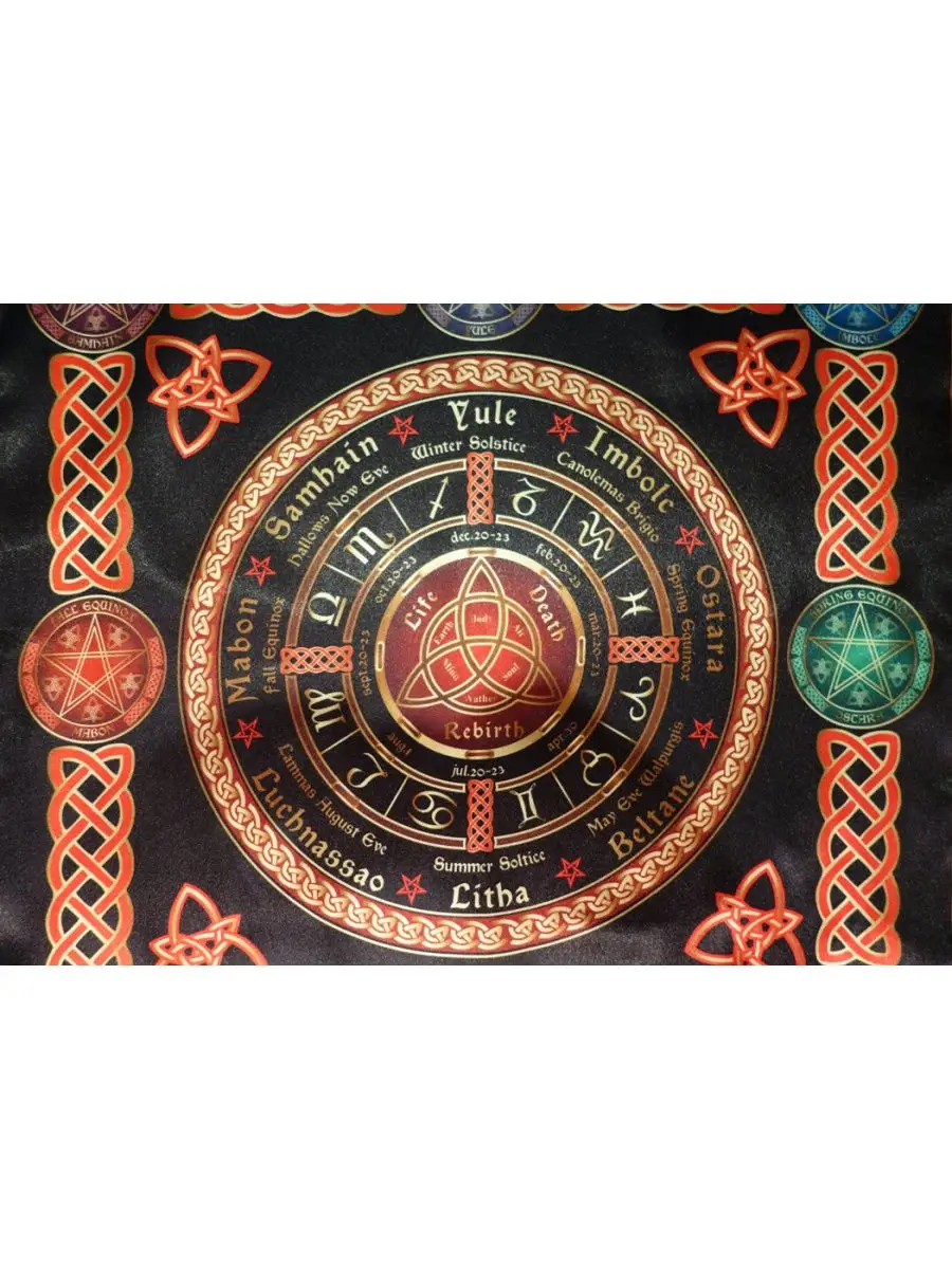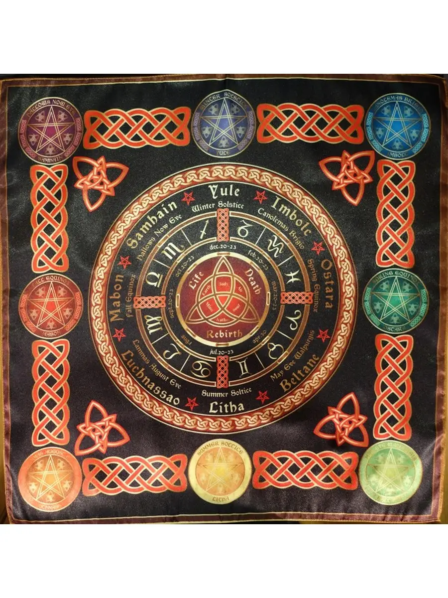 Скатерть Ритуальная декоративная Колесо Года средняя. Скатерть календарь Колесо Года создана на основании учения Древней Викканской традиции. Скатерть содержит указание на 8 основных праздников Викканской магии и описывает основные элементы викканской традиции. Также скатерть содержит указание на знаки Зодиака и время проведения 8 основных праздников Викканской магии. Скатерть может стать и красивым украшением рабочего убранства и справочником, который подскажет нужную информацию. Материал атлас. Размер 60х60 см.