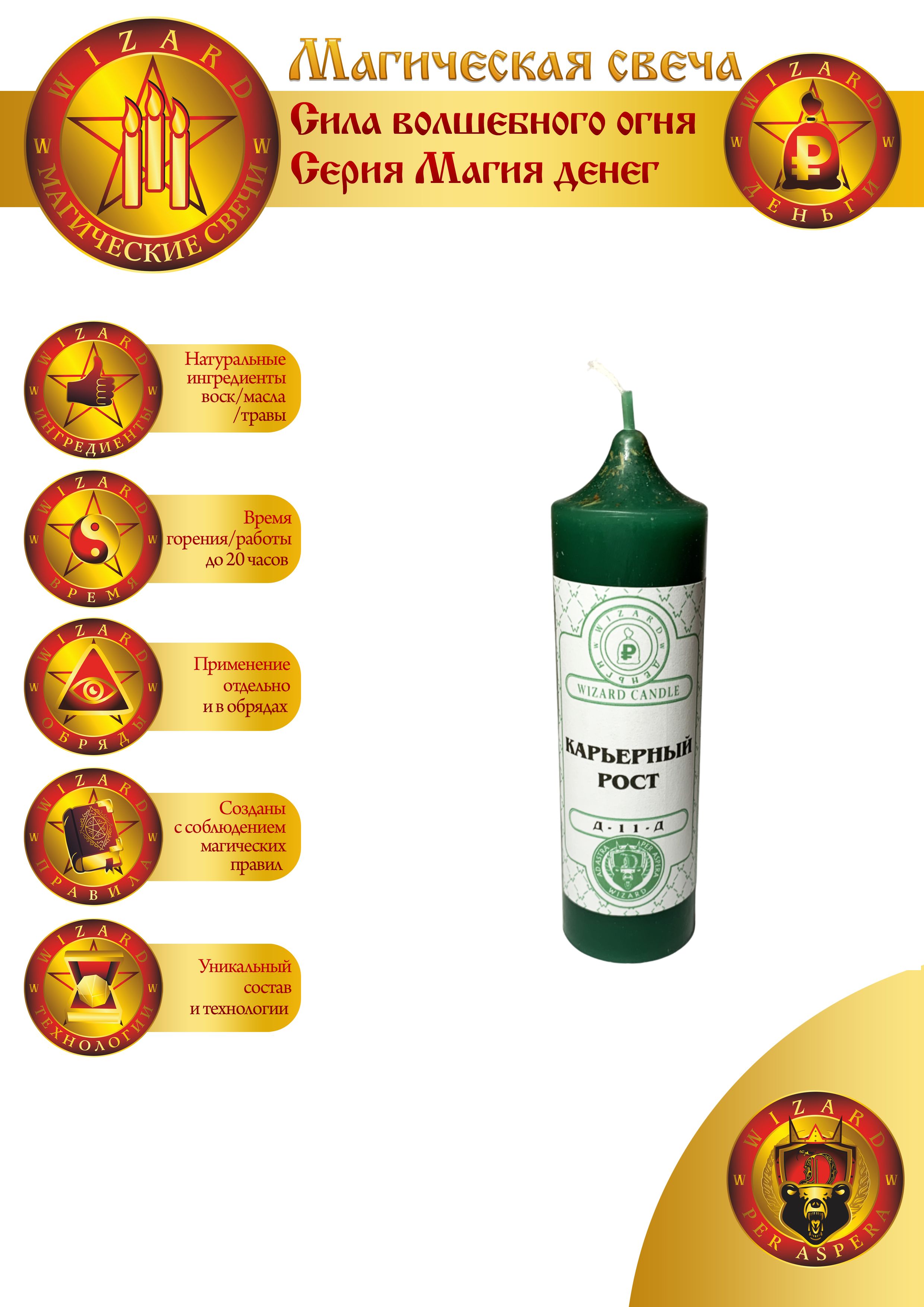Свеча, помогающая в вопросах Карьерного роста и продвижения по службе. Она входит в состав обрядов, которые не только стимулируют рост, но и устраняют помехи или указывают на ошибки, которые мешают успешному продвижению по карьерной лестнице.