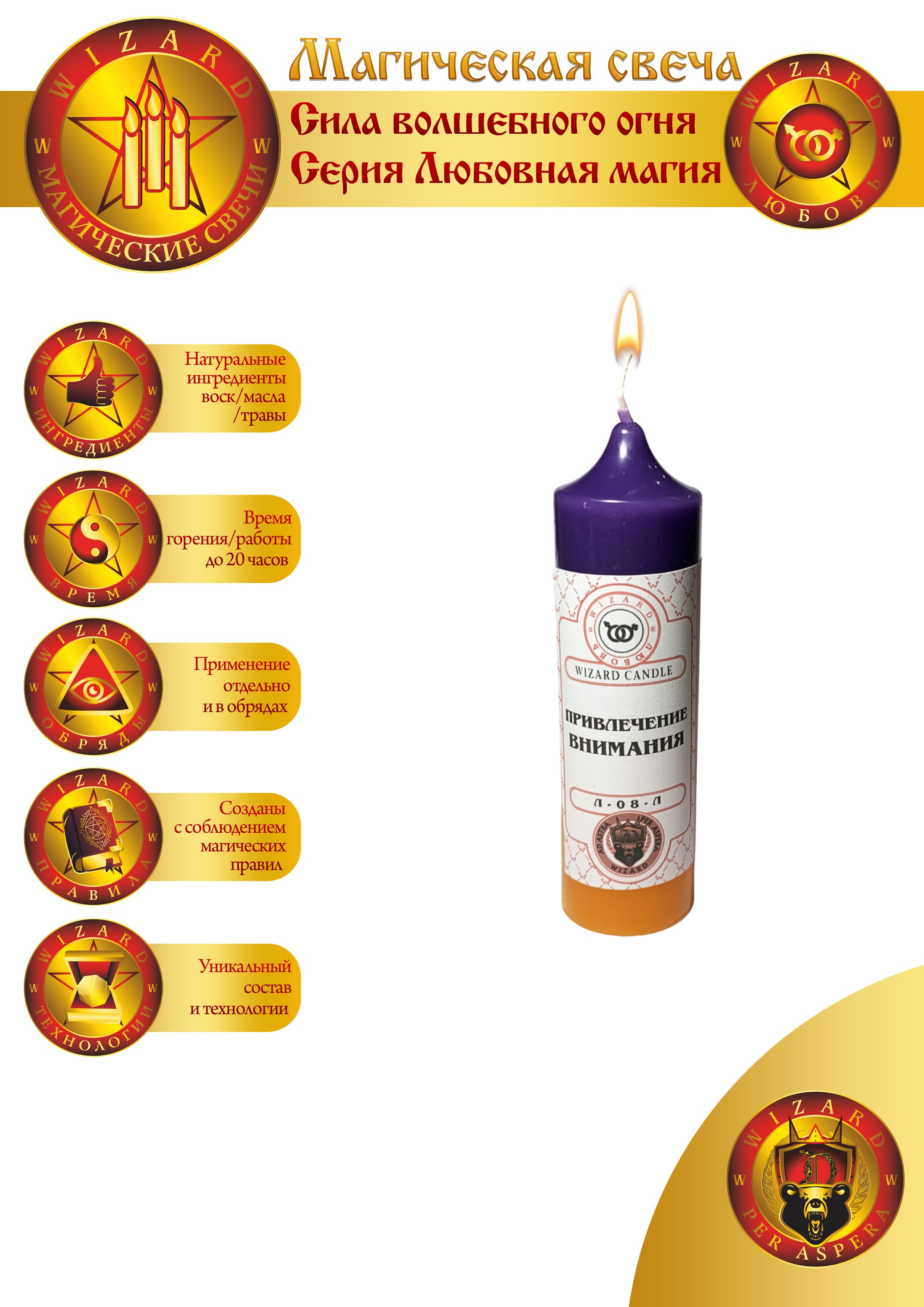 Свеча создана для привлечения внимания и интереса к конкретной персоне. Свеча может быть использована и в существующих отношениях, когда, как кажется, интерес партнера начал угасать, так и в формирующихся отношениях, чтобы привлечь внимание нового или интересующего вас партнера.