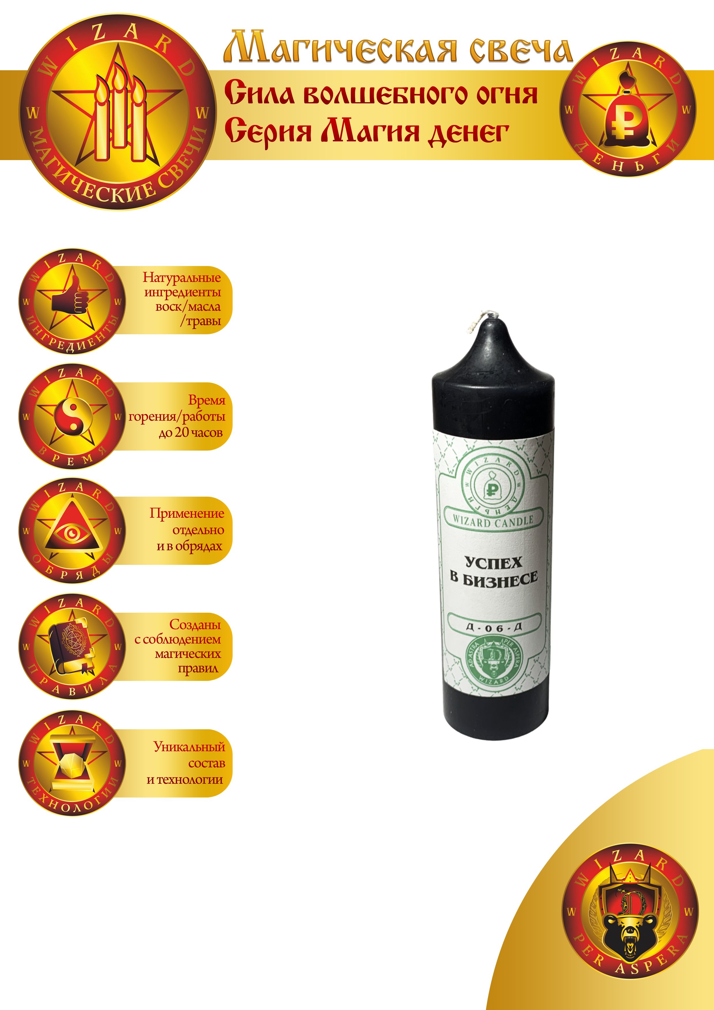 Свеча Успех в бизнесе предназначена для тех, кто сам определяет размер своей зарплаты или для тех, кто имеет прямое отношение к руководству бизнеса и способен не только к магическим, но и к практическим действиям. Задача свечи усилить успешность бизнеса и осуществить влияние на его финансовые составляющие.