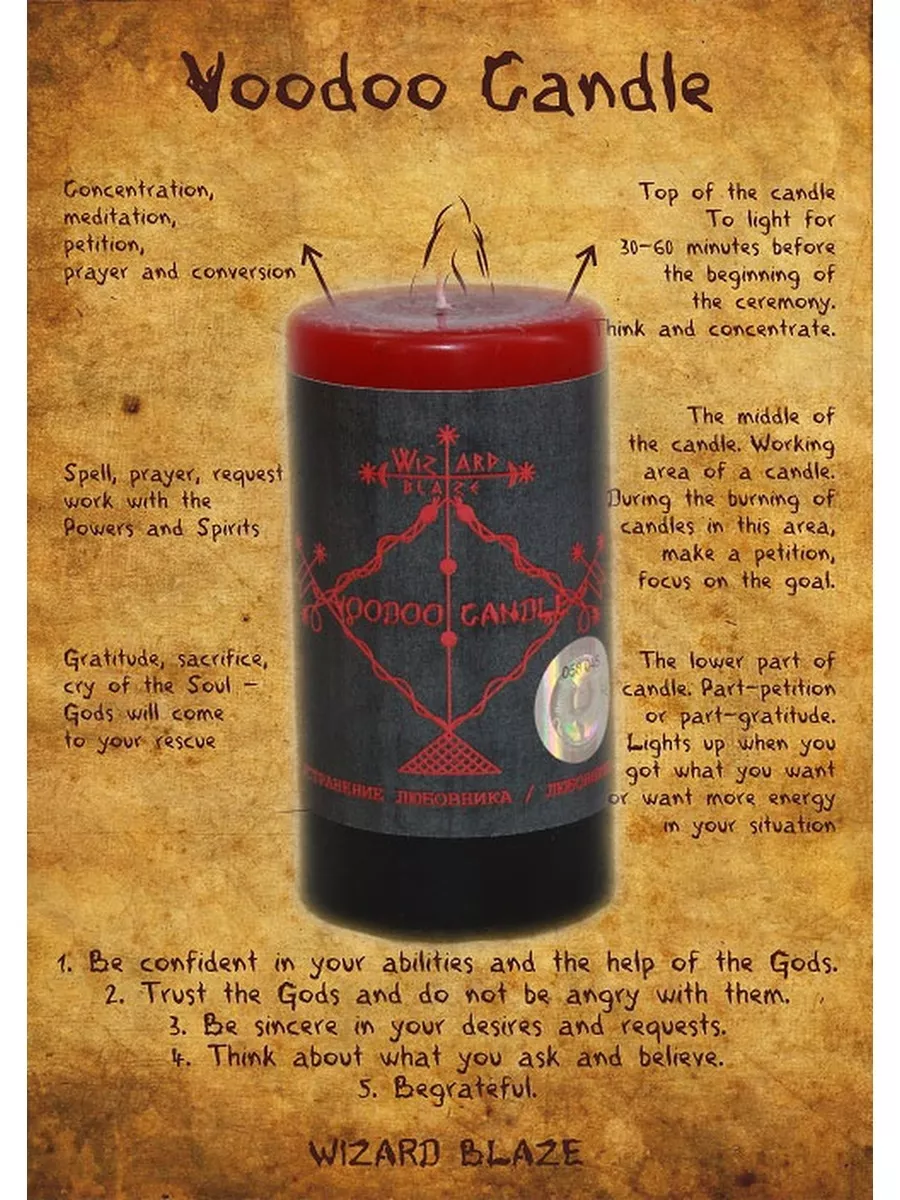Свеча Вуду Устранение любовника или любовницы. Свеча Вуду Устранение любовника или любовницы используется в том случае, если на вашем пути возникла любовница или любовник, мешающие вашим взаимоотношениям. Разместите его или ее фото на свечу или напишите имя английскими буквами. Каждое утро и каждый вечер зажигайте свечу, мысленно представляя себе человека. Если вы не знаете его имя и только подозреваете, не страшно, напишите Она или Он и проводите время перед свечей. Технология: Свеча изготовлена по древней магической технологии с соблюдением всех правил и требований, ритуальных практик. Материал: Материал свечи природный воск, натуральные травы и масла, все это создает уникальные характеристики влияния свечи. Масса: 180 гр. Размер: Высота 9,5 см Диаметр 5 см.
