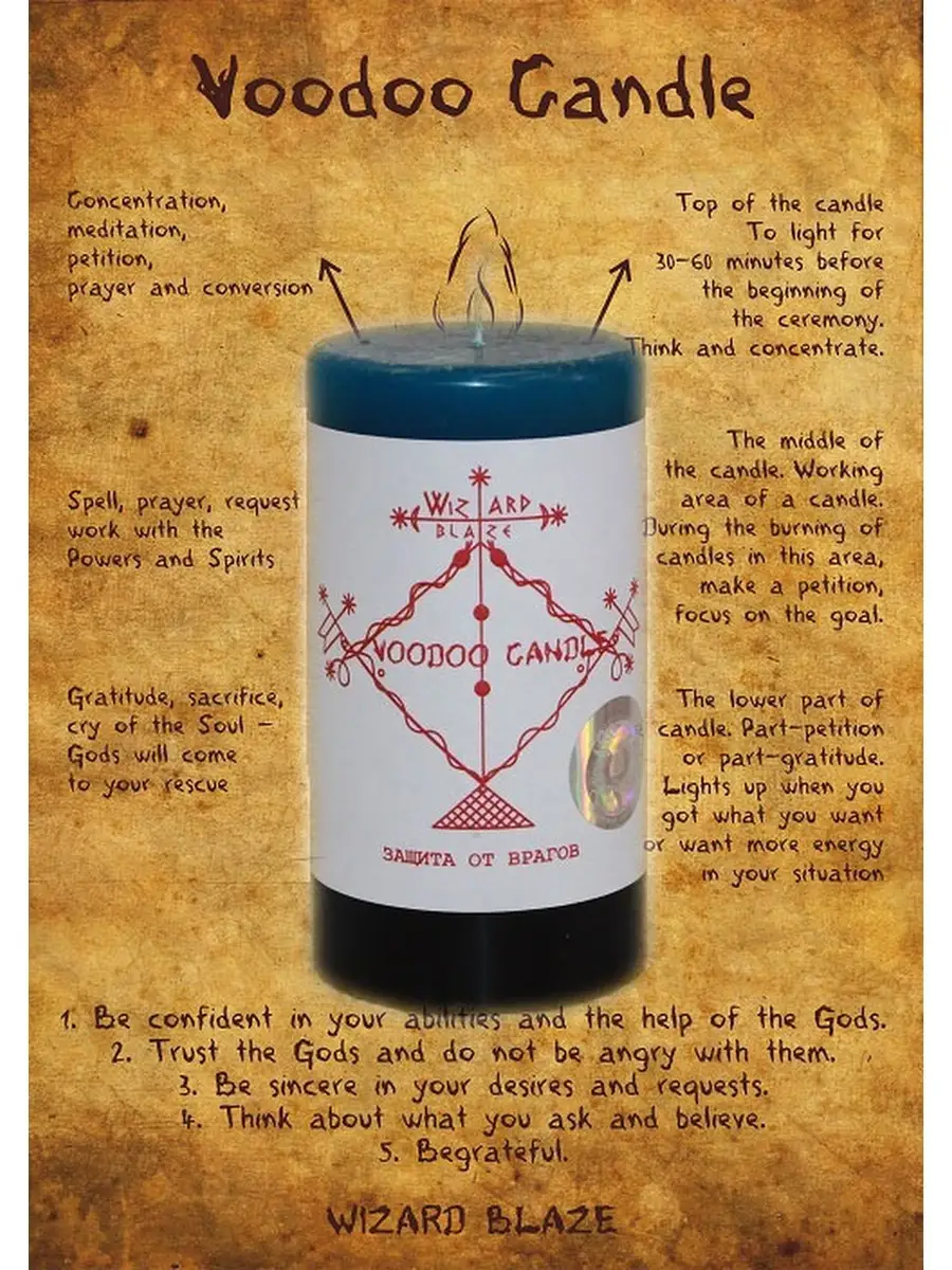 Свеча Вуду Защита от врагов. Свеча Вуду Защита от врагов, это свеча устранения влияния врагов, которые мешают вашей жизни. Причем не важно, магическое это влияние или фактическое, знаете ли вы врагов или нет, важно, что есть предположение, с которым можно работать. Технология: Свеча изготовлена по древней магической технологии с соблюдением всех правил и требований, ритуальных практик. Материал: Материал свечи природный воск, натуральные травы и масла, все это создает уникальные характеристики влияния свечи. Масса: 180 гр. Размер: Высота 9,5 см Диаметр 5 см.