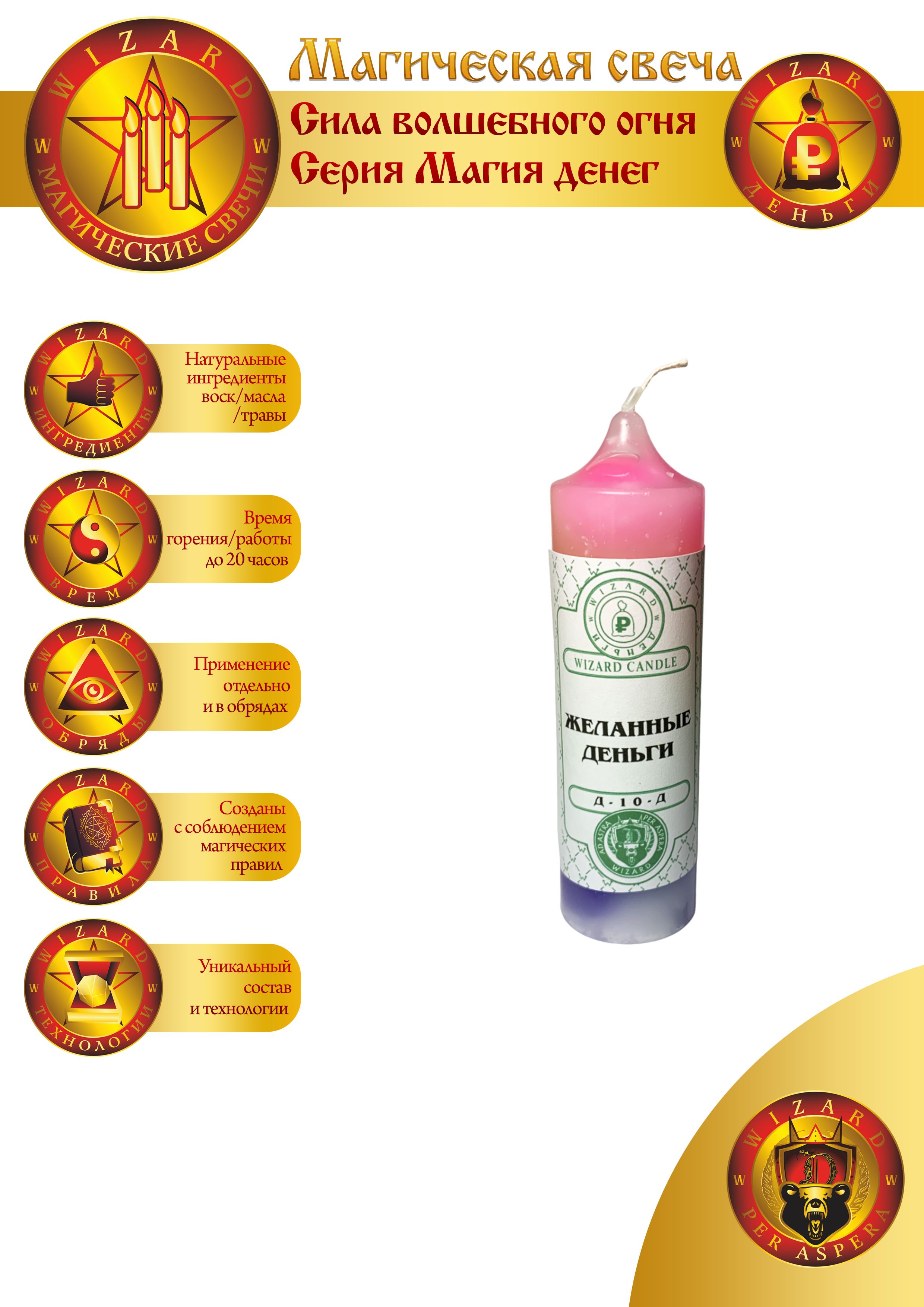 Свеча, предназначенная для быстрого привлечения требуемой суммы – как для решения какого-либо вопроса, так и просто для того, чтобы получить желаемое. Свеча может использоваться и как компонент обряда, создавая дополнительное влияние в других финансовых схемах.