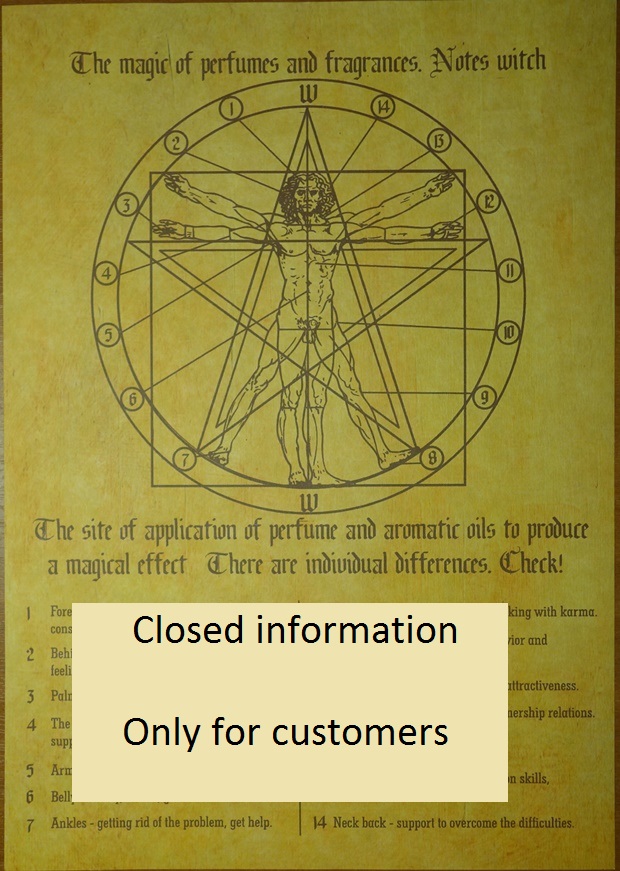 Свиток Сила Магических духов – древняя информация, которая дошла до наших дней. В ней содержится ключ к применению ароматов магических духов на теле человека. Каждое из 14 мест на теле человека обладает определенным влиянием на жизнь человека. Вы применяете магических духи или ароматические масла и получаете желанный эффект.