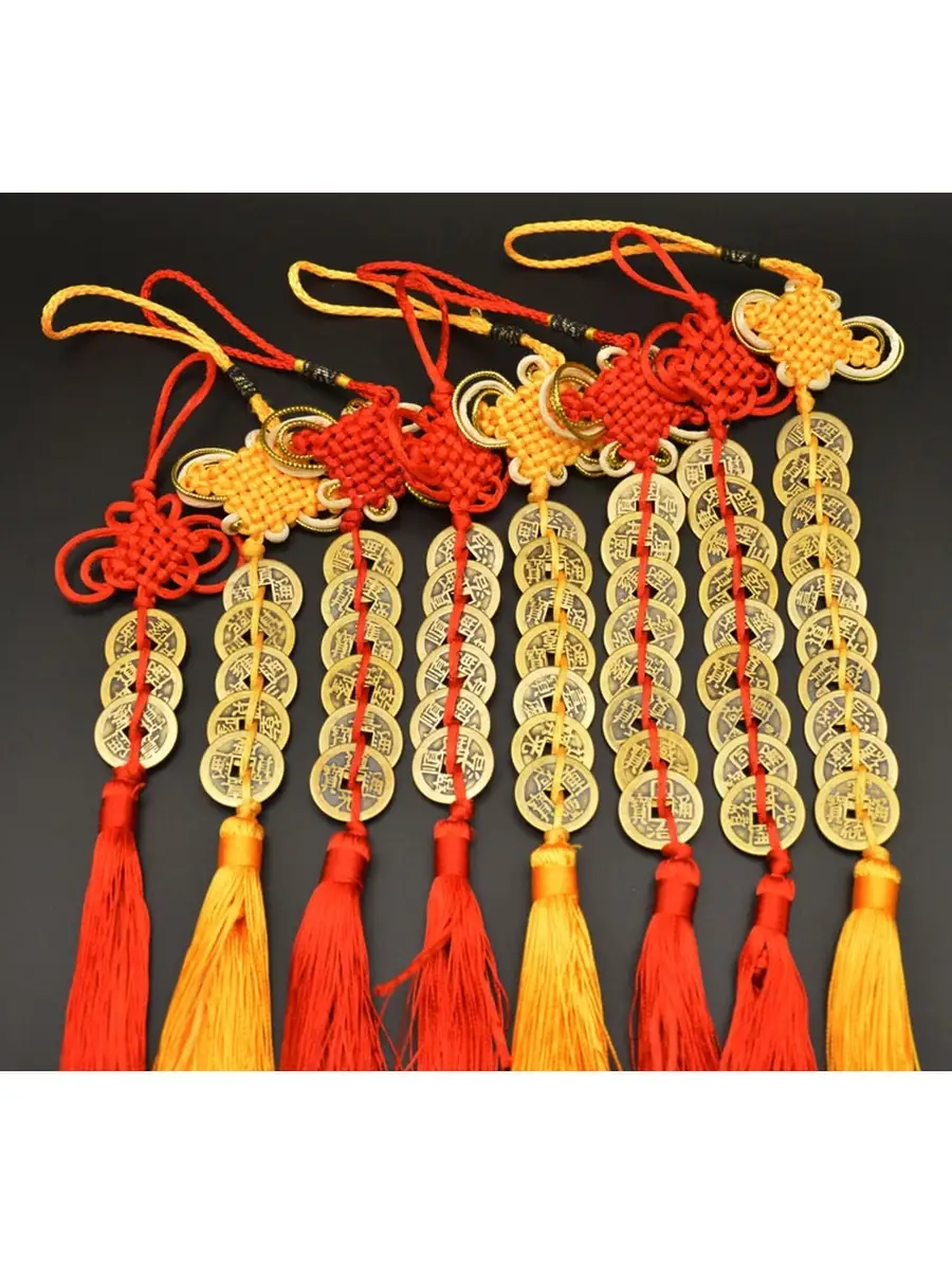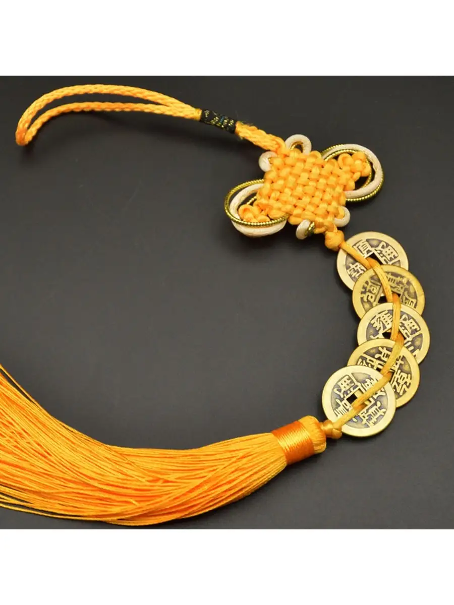 Талисман с китайскими императорскими монетами, достаток. Сплетение из 5 монет отображает достаток от 4 сторон света. Китайские монетки, это один из сильнейших талисманов благополучия. Особенно такие объекты эффективны для притягивания богатства. Монета изготавливается из меди. Её округлая форма символизирует энергию Неба, а центр с квадратной дыркой энергию Земли. Все монеты имеют 2 стороны: активную и пассивную. Активная сторона это Ян, мужское начало. На ней изображено 4 иероглифа. Пассивная сторона это Инь, женское начало. На ней изображены 2 иероглифа. Объединяя в себе 2 противоположные энергии, Ян и Инь, такой талисман призван активно привлекать в жизнь гармонию и счастье.
