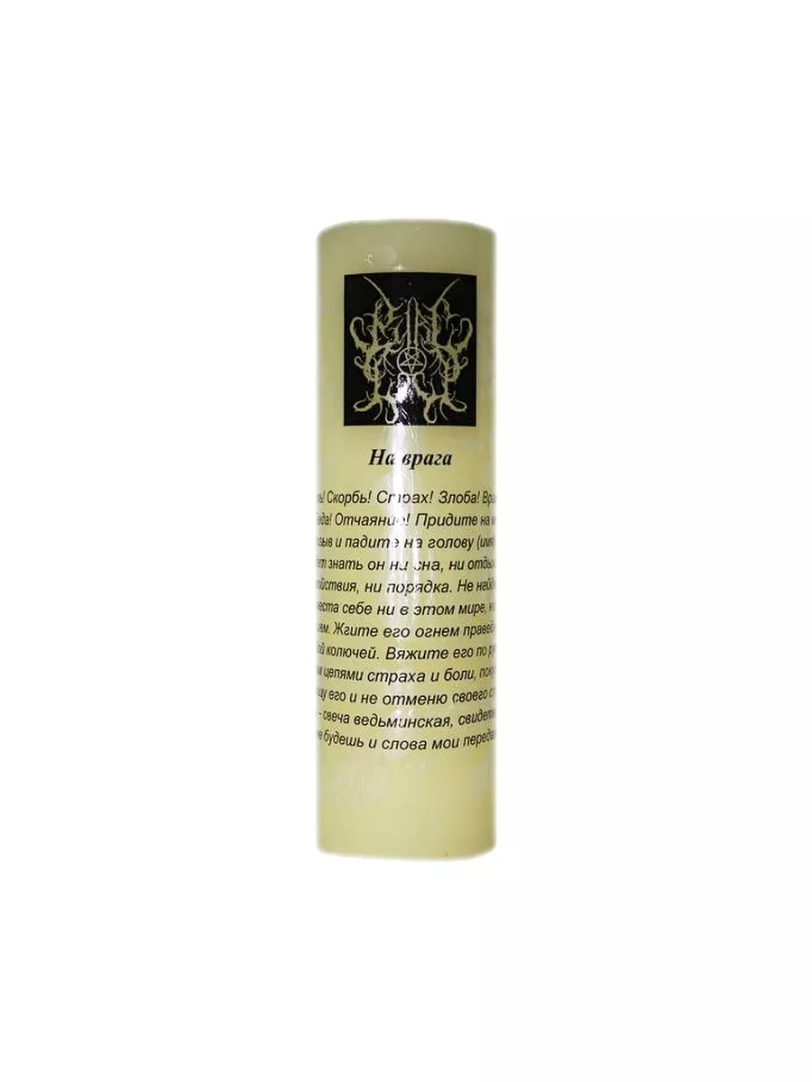 Заговорная свеча На врага (Бессилие врагов) Заговорная свеча На врага используется против врагов, которые вам реально мешают или у вас возникает ощущение, что рядом с вами враг, который может нанести вам вред. Заговорные свечи используют в своем влиянии силу Слова - заговора, который произносится на свече и Силу Огня, который усиливает Действие Слова. Это делает влияние Заговорных свечей уникальным, не похожим ни на одни Магические свечи. Размер: 50 х 160 мм Вес: 280 гр Состав: пчелиный воск, парафин, масла, травы.